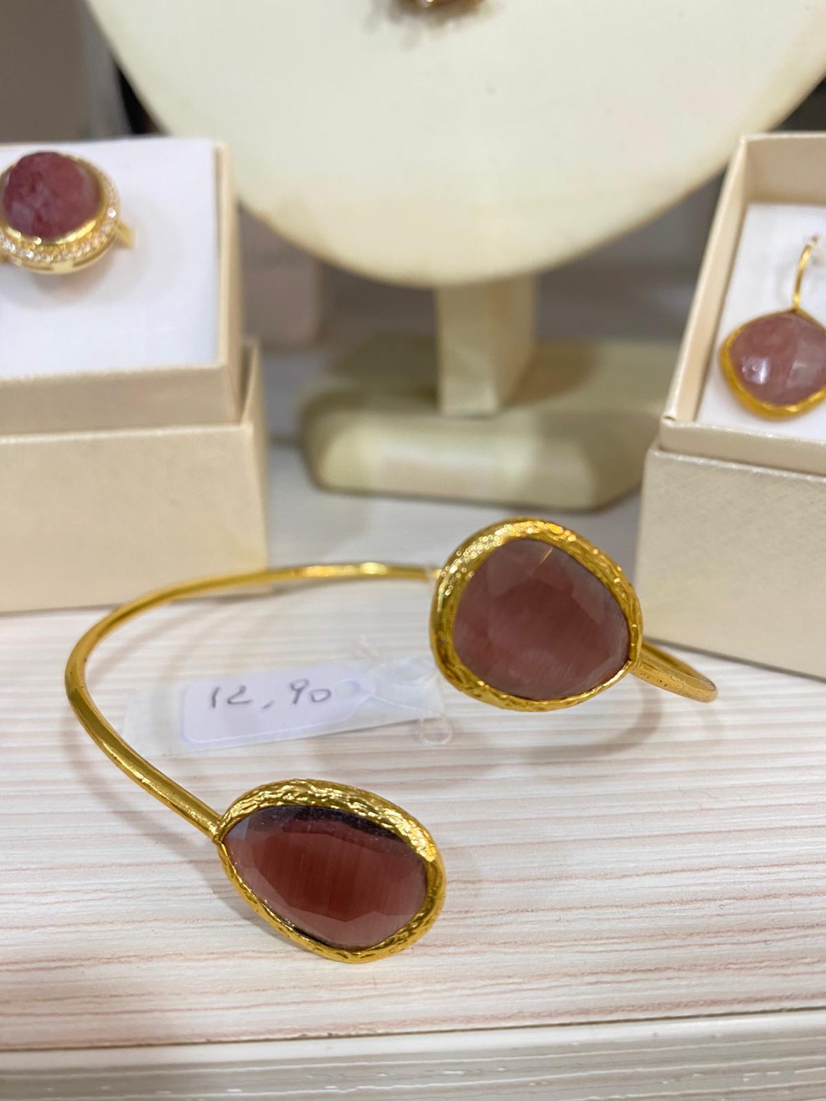 Bracciale Bangle: Modello rigido aperto, moderno e minimal, rifinito con due pietre di Quarzo Fragola alle estremità .