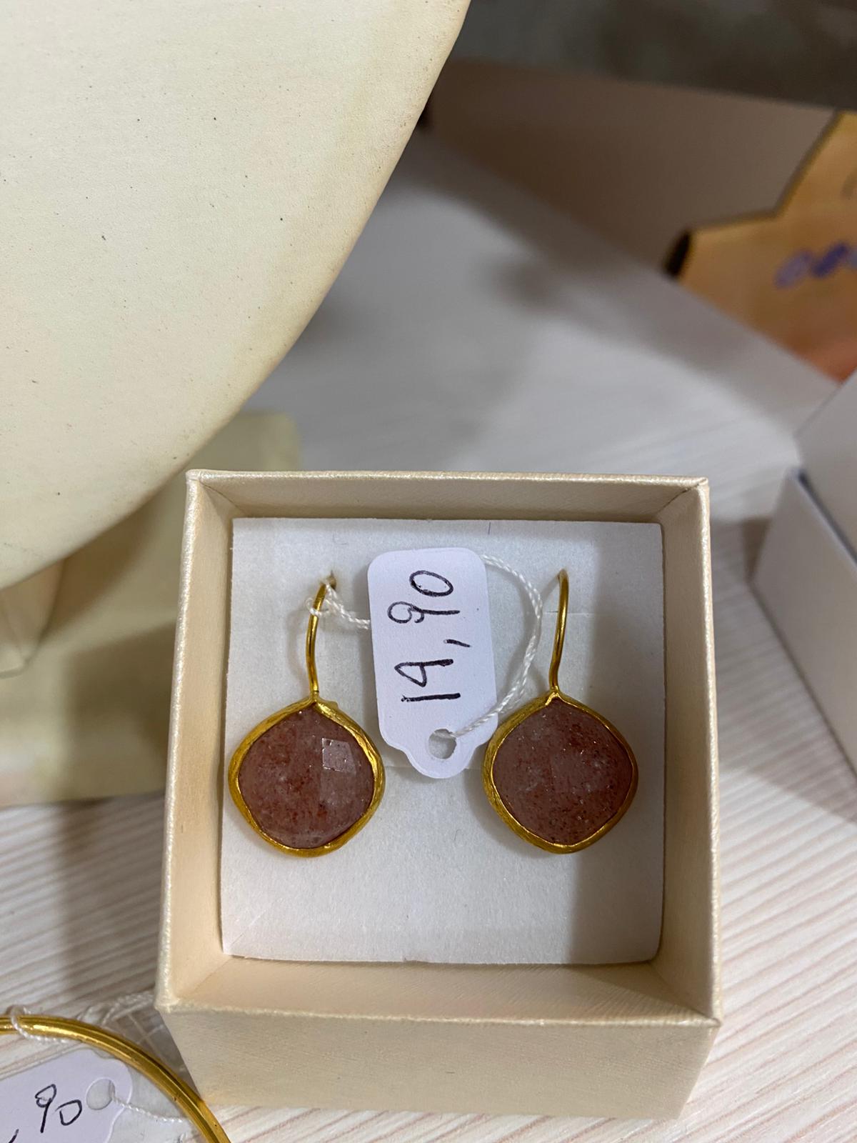 Orecchini Pendenti: Semplici ed eleganti, con pietre tonde incastonate in una montatura dorata che mette in risalto la texture naturale della gemma.