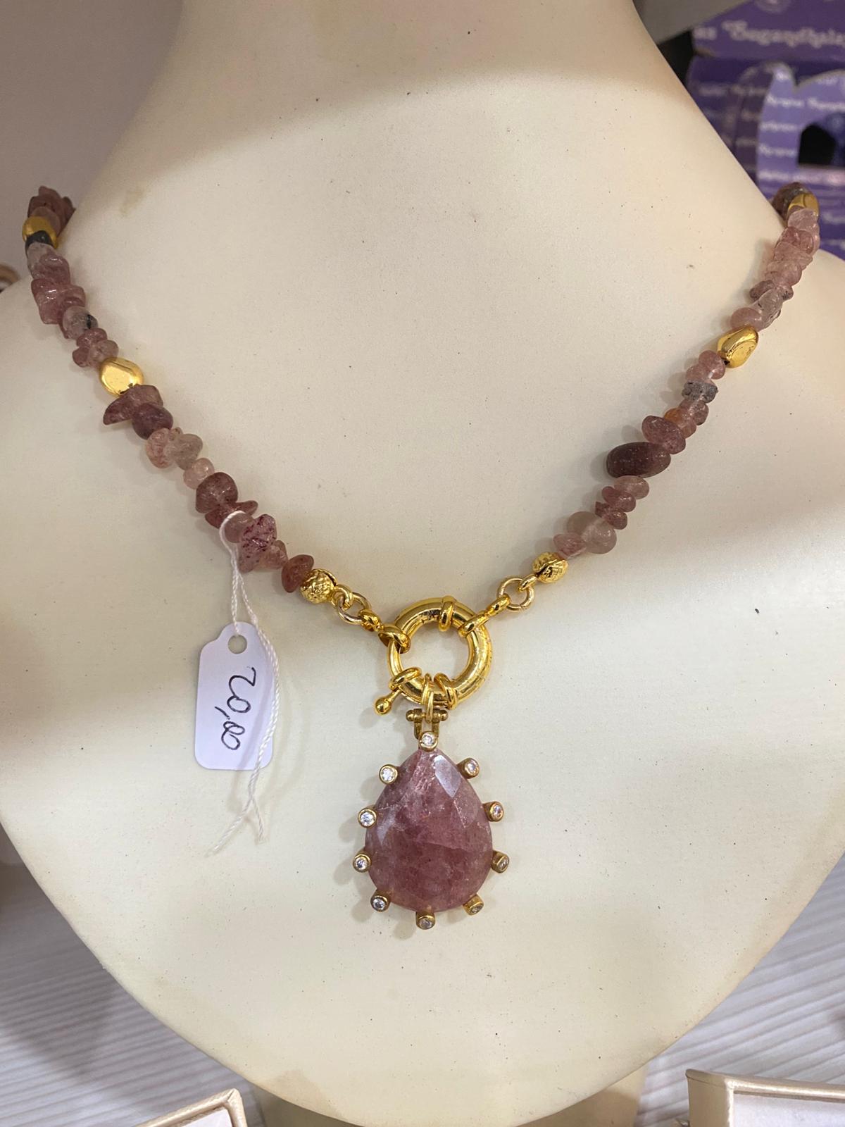 Materiali: Quarzo Fragola Naturale, Metallo con finitura dorata, Cristalli.