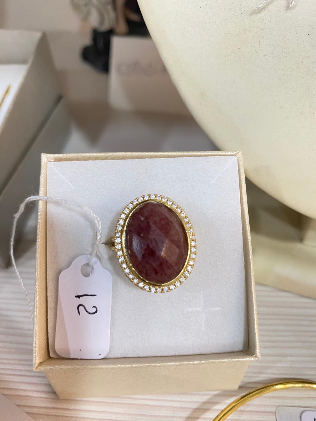 Anello "Halo": Un magnifico cabochon ovale di Quarzo Fragola circondato da una corona di cristalli brillanti, montato su una fascia dorata regolabile.