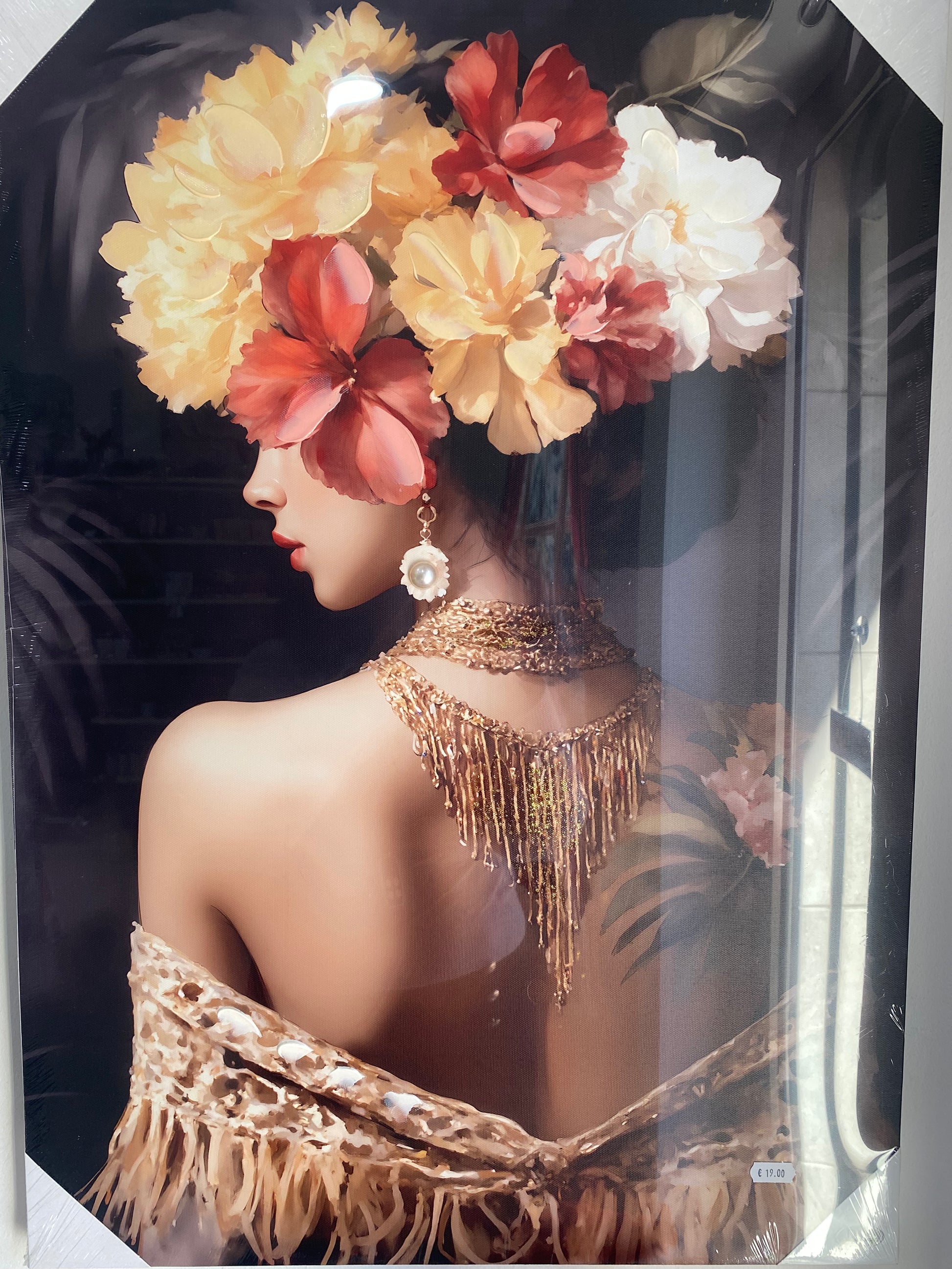 Soggetto Regale: Ritrae una donna di spalle, con il viso nascosto da una maestosa coroncina di grandi fiori nei toni del giallo, bianco, arancio e rosso scuro.