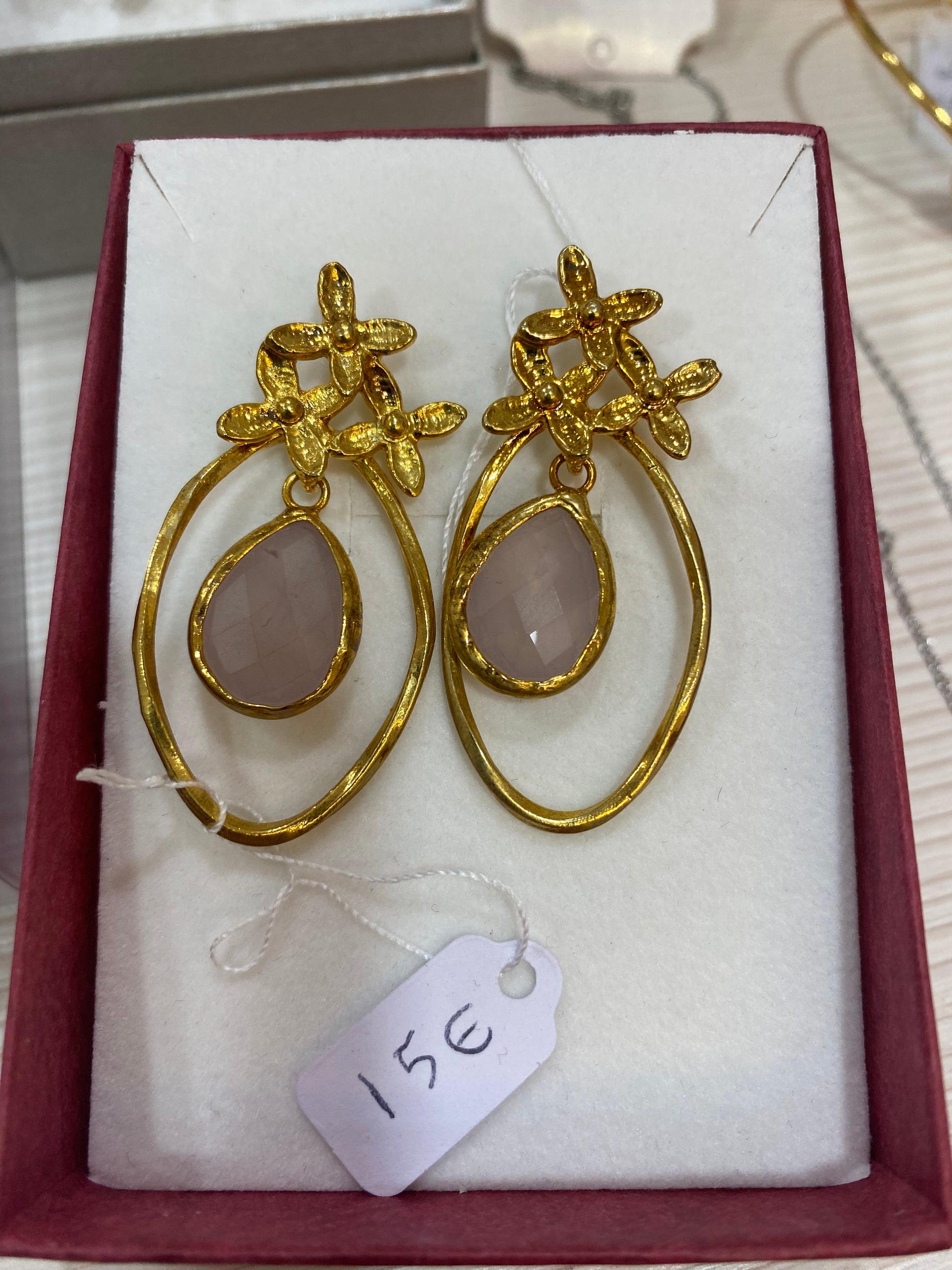 Pendente a Goccia: Dai fiori scende un grande ovale aperto in metallo dorato. Al suo interno, incastonata con cura, pende una pietra a forma di goccia.