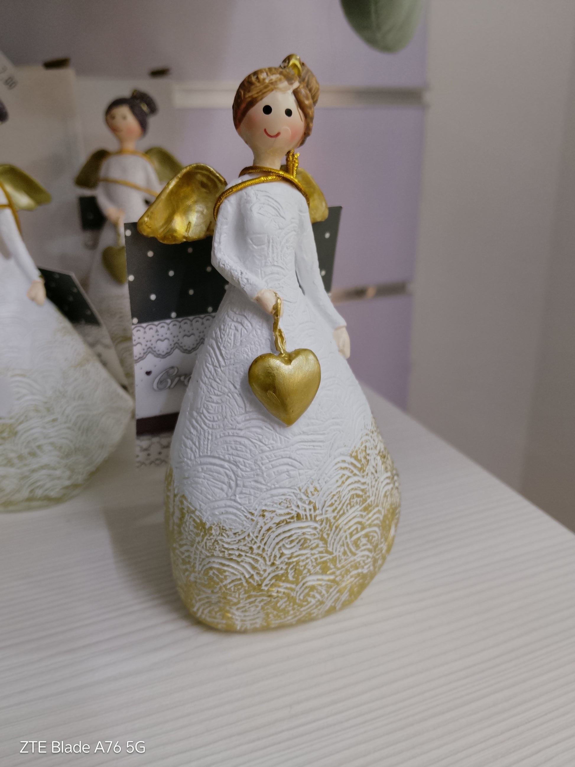Titolo: ✨ Messaggero di Luce! Statuina Angelo in Bianco e Oro con Cuore Sospeso